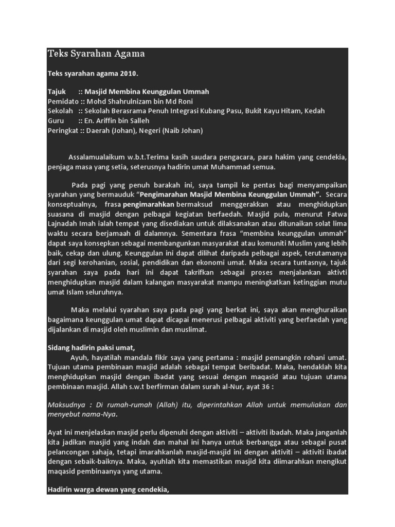 Contoh Teks Syarahan Agama / Mencari contoh teks ceramah singkat untuk kultum di sekolah atau masjid di dekat rumah?