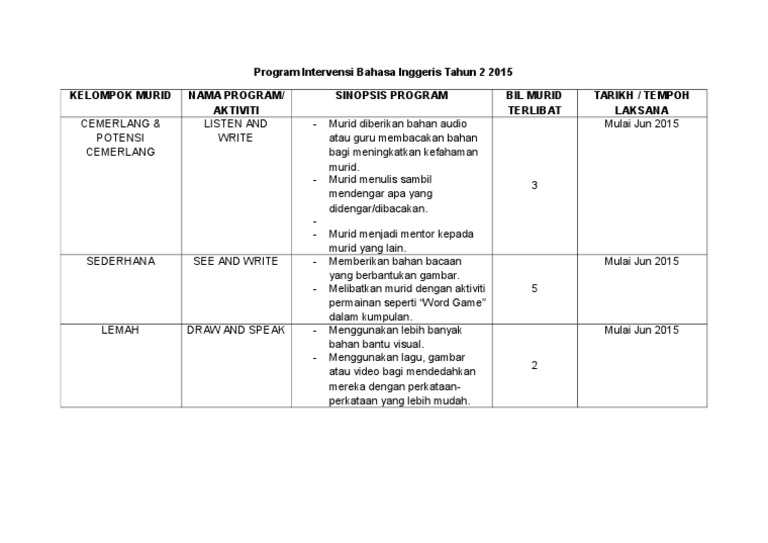 Intervensi Group Pdf Document from demo.vdocuments.site Membantu murid lemah memerlukan kesabaran dan kemahiran tertentu. Bahasa inggeris adalah salah satu bahasa yang paling meluas penggunaannya di seluruh dunia. Nama sinopsis program program/ aktiviti diamond 1 menyediakan soalan kertas 1. Kalimat ini berasal dari sumber eksternal dan mungkin tidak akurat. Bisa kalian baca secara gratis, tersedia juga ribuan koleksi manga, manhua dan manhwa yang update setiap hari. Okay, ni saya nak share contoh pelan intervensi bahasa inggeris tahun 6 yang saya buat tahun yang ni tahun lalu saya buat untuk kelas saya sendiri untuk kenalpasti cadangan intervensi yang yang penting, kenalpasti masalah murid tu terlebih dahulu, kat mana mereka banyak buat silap, kat. Antara sebab utama ialah, bahasa kalau percakapan sepanjang hari? Koleksi soalan kali ini merupakan latihan bina ayat dan note expansion.
